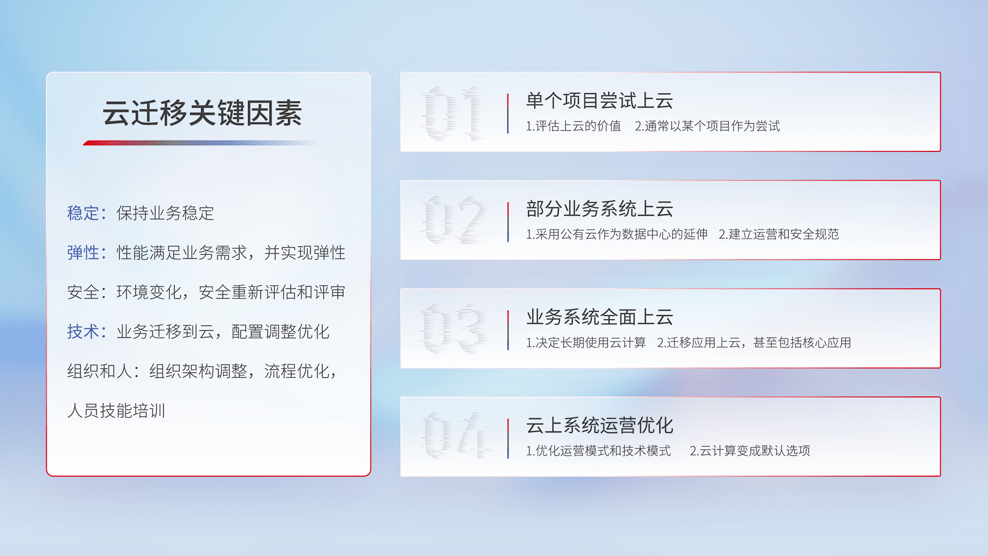 结合实际业务,,,,从规划设计、、、、云平台选型、、、、云原生改造、、、数据迁移、、、集成交付,,,,迁移全过程为客户识别最佳上云路径,,,做好风险识别管理,,,设计网络架构、、、、身份权限、、、安全审计合规、、、操作审计、、、日志审计、、监控告警策略、、多站点容灾设计等,,,对云上基础设施进行整体规划,,,,提升IT治理水平,,,以满足弹性、、、、高可用、、高性能的需求。。。