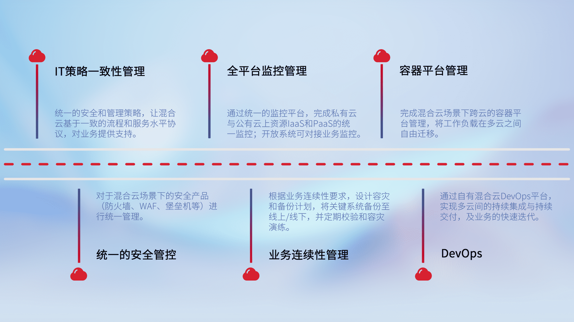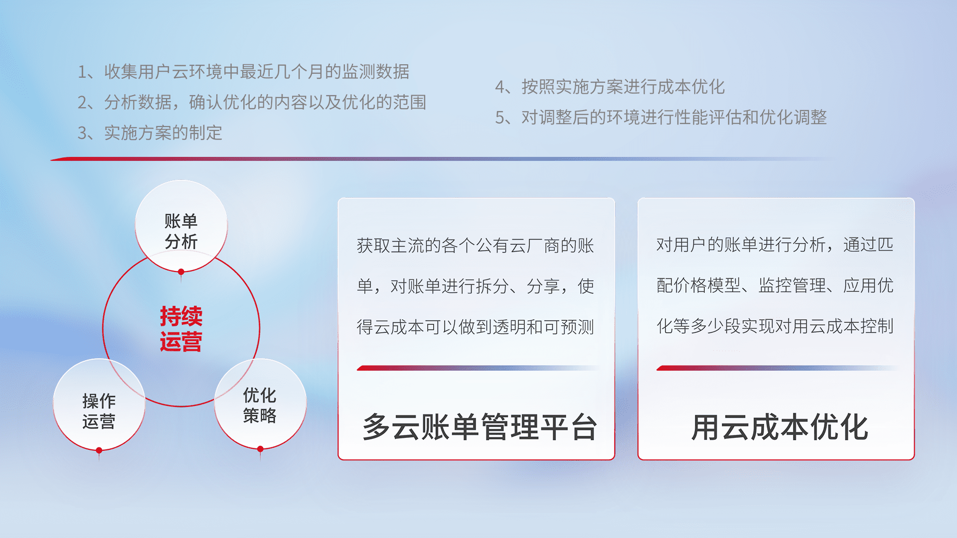通过多云纳管,,,,以统一的资源数据模型把客户的云资源进行抽象和封装,,,,进而实现对多云资源的统一操作,,保障云资源管理的可靠性、、、稳定性与可用性。。。。量身定制化运维内容,,,配置、、、、开发运维、、补丁管理、、、、备份、、、、监控、、、、认证和访问管理、、、审计和日常巡检等,,保障在用云过程中的可靠度,,稳定度以及高可用率。。