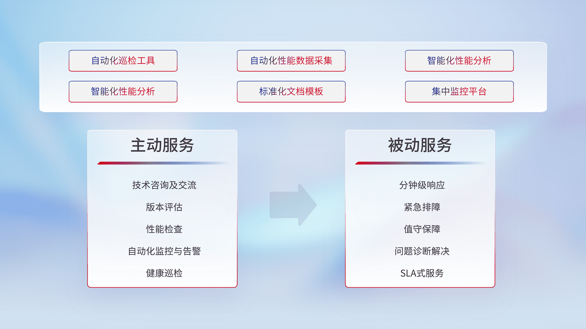 智能化工具和标准化文档,,,,保障服务质量,,提供主动服务(包含技术咨询、、、版本评估、、、、性能检查、、、、自动化监控与告警、、、、健康巡检)和被动服务包含(分钟级响应、、、紧急排障、、值守保障、、问题诊断解决、、SLA服务)。。。。