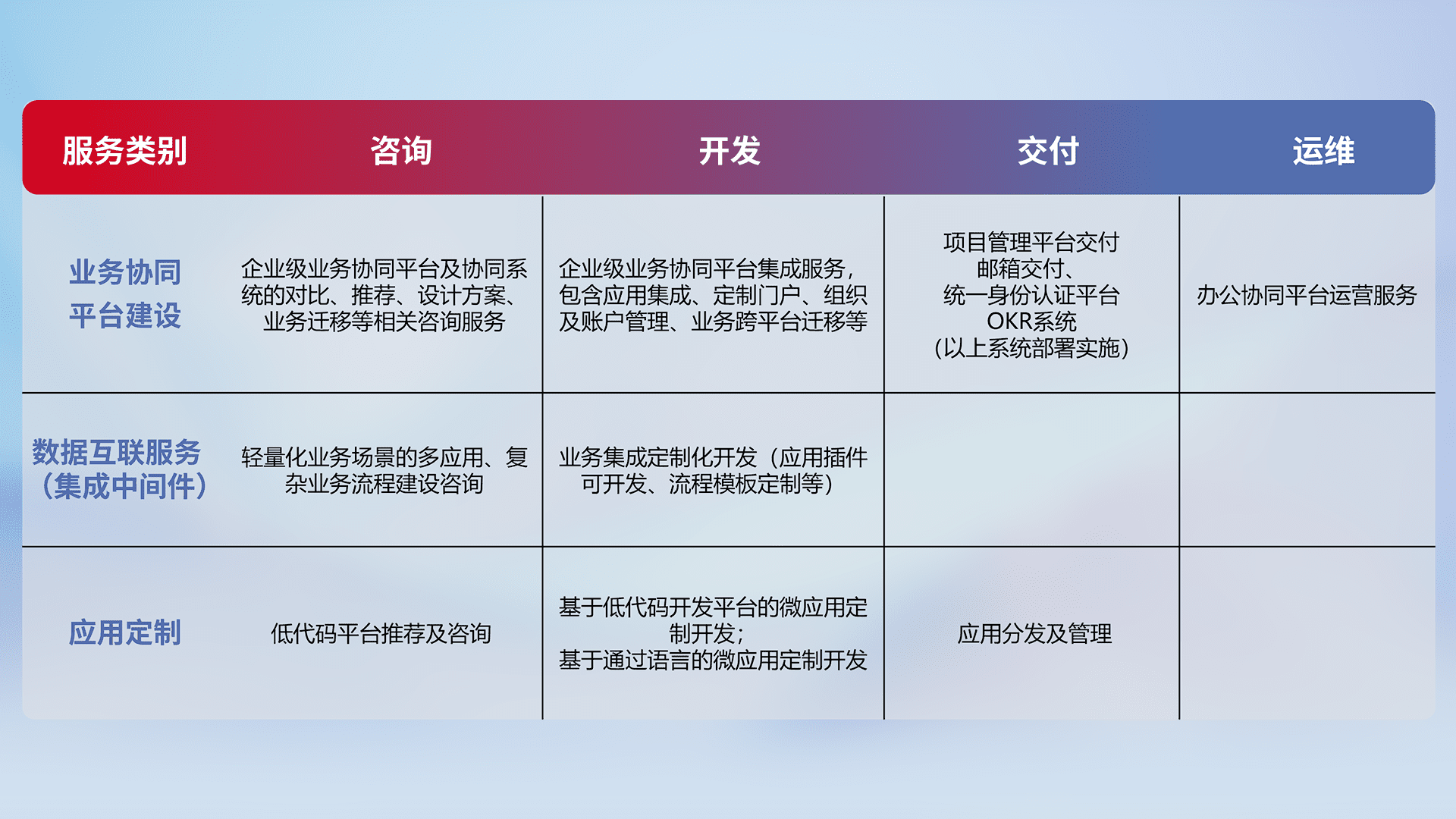 针对钉钉、、、企微、、、IDaas等平台级产品提供产品的规划、、、方案、、交付、、定制化开发等服务,,实现如统一协同办公、、、智能客户服务、、混合会议管理、、、、智能数据查询、、、、等业务场景,,,,实现数字化转型。。。。